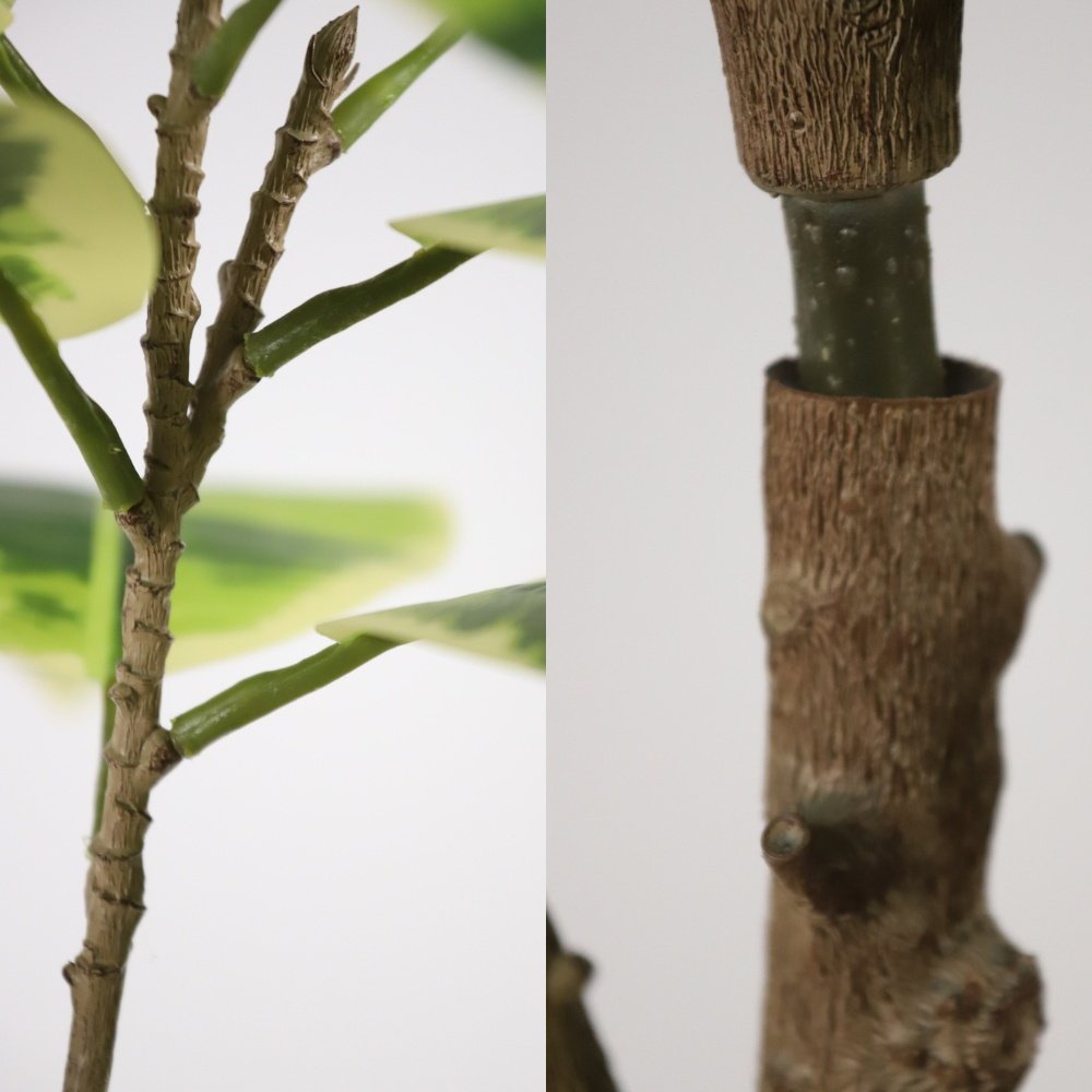 Standing 185 cm tall, this artificial decorative rubber tree is crafted from durable PE material with clearly defined leaf veins. The foliage features varied leaf sizes, naturally scattered for an authentic look. Its trunk replicates real wood grain with branching details, free from plastic shine and offering a natural touch.Each sub-branch is detachable, and the trunk is designed in three removable sections, reducing packaging volume and cutting shipping costs. The detachable structure also allows the height to be adjusted from 185 cm to 160 cm, while the root base curves naturally for a realistic finish.